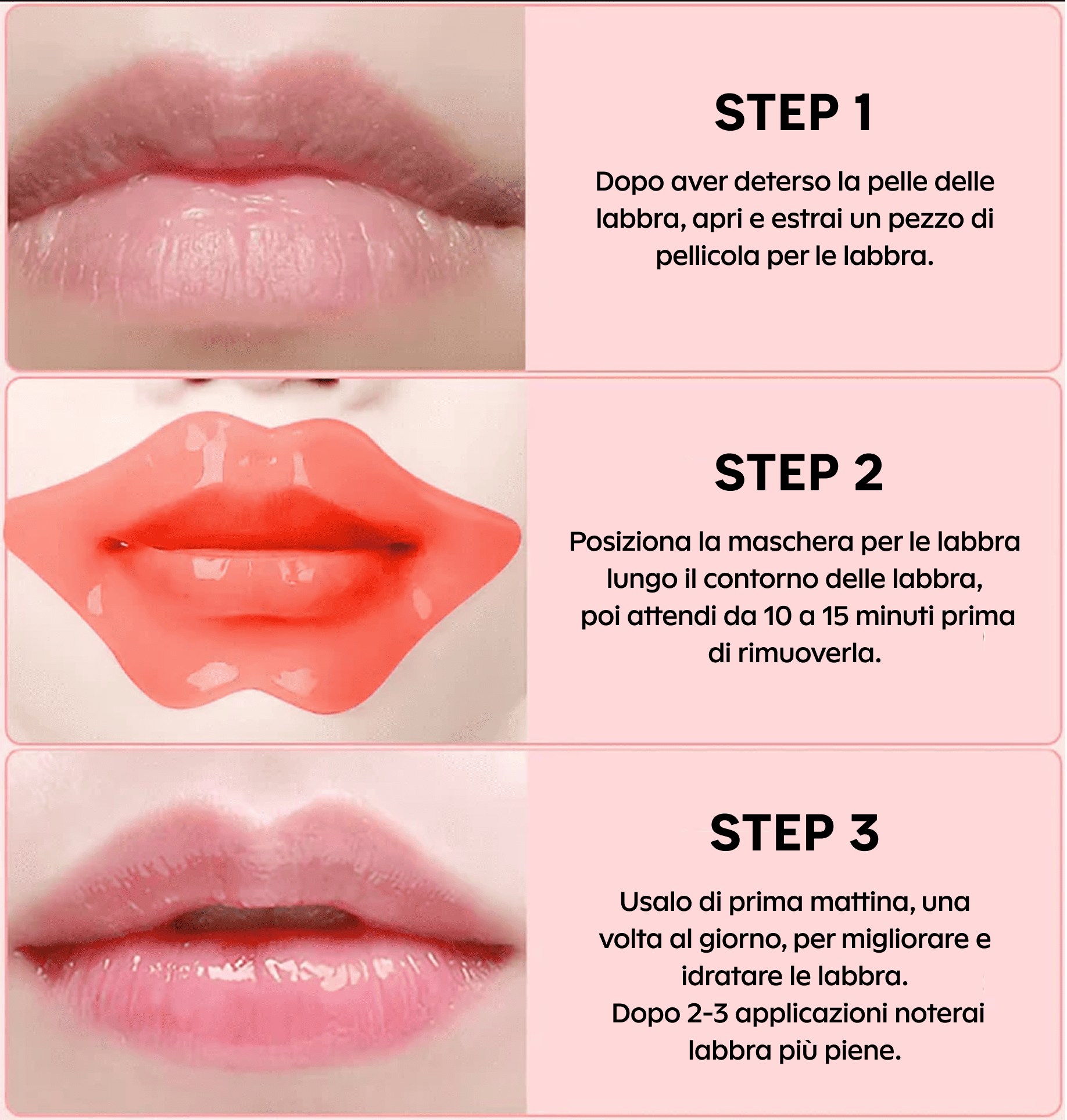 Chaque patch est enrichi d'ingrédients actifs qui pénètrent délicatement la surface des lèvres, les laissant immédiatement plus pleines et douces. Il suffit d'appliquer le patch et de le laisser agir quelques minutes : les lèvres absorbent l'hydratation nécessaire, réduisant les gerçures et la sécheresse. Une fois retiré, le patch laisse une sensation de douceur qui dure toute la journée, avec un arôme délicat qui sublime l'expérience.