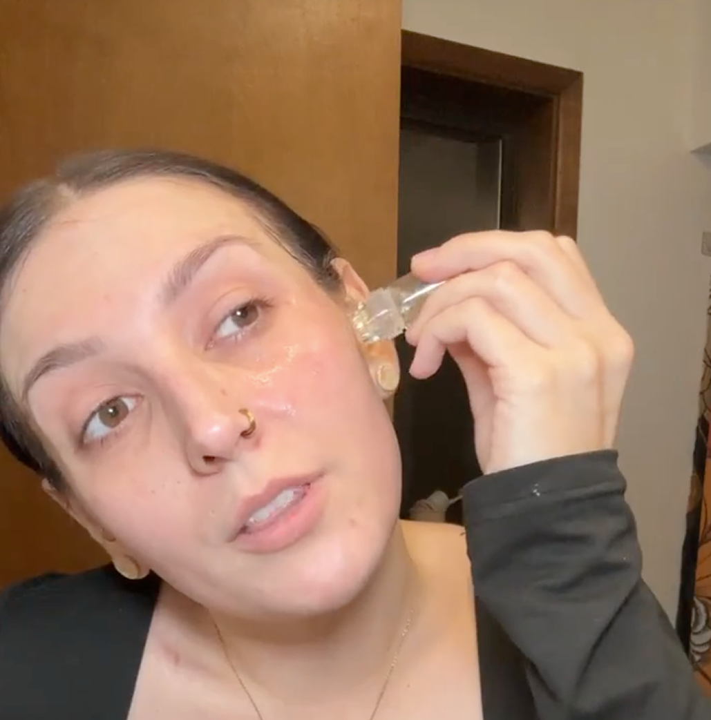 Step 3: Passa delicatamente il dispositivo sulla pelle 2-3 volte fino a quando il siero non esce più dagli aghetti e spalma manualmente il siero restante nella boccetta a mano.