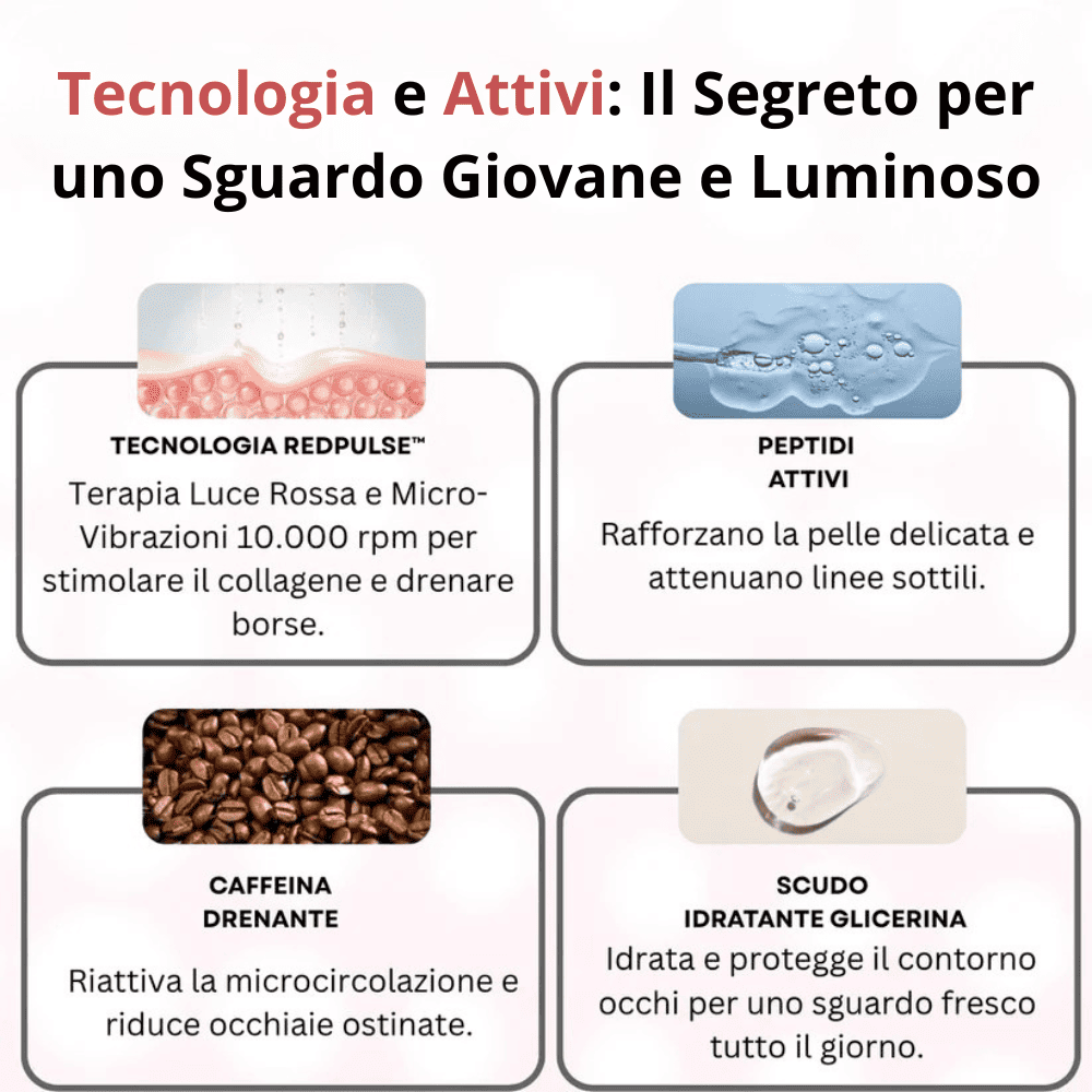 Si applica in pochi secondi, con l’aiuto del massaggiatore integrato a micro-vibrazione e luce rossa, e dona uno sguardo più riposato e luminoso già dalle prime applicazioni.