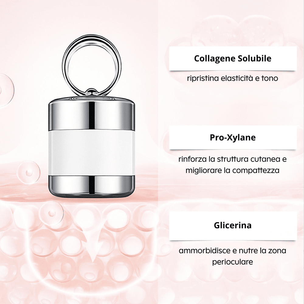 - Pro-Xylane™ (Hydroxypropyl Tetrahydropyrantriol) – Attivo brevettato anti-età che stimola la sintesi di collagene e rinforza la struttura cutanea, migliorando la densità e la tonicità del contorno occhi.